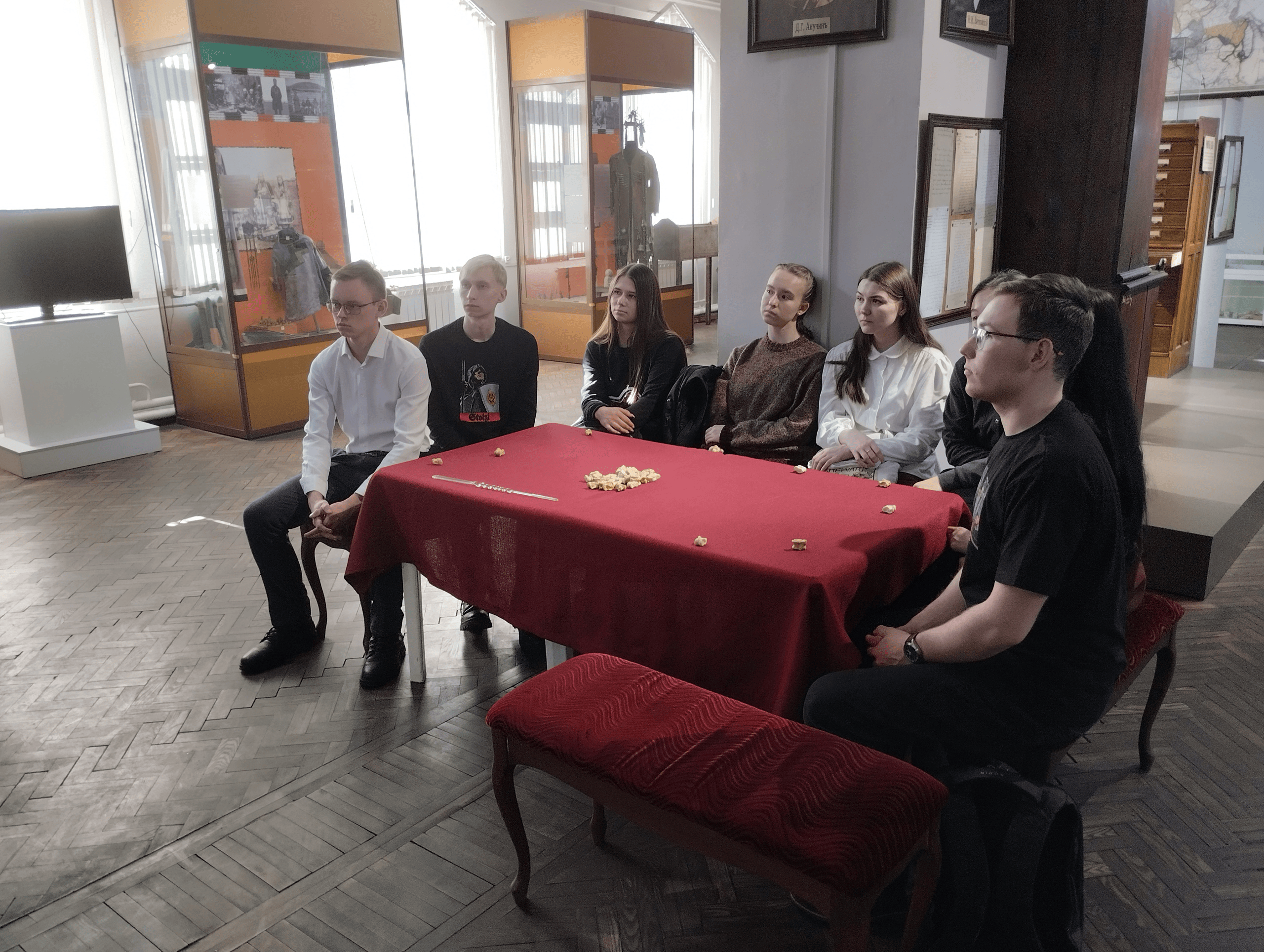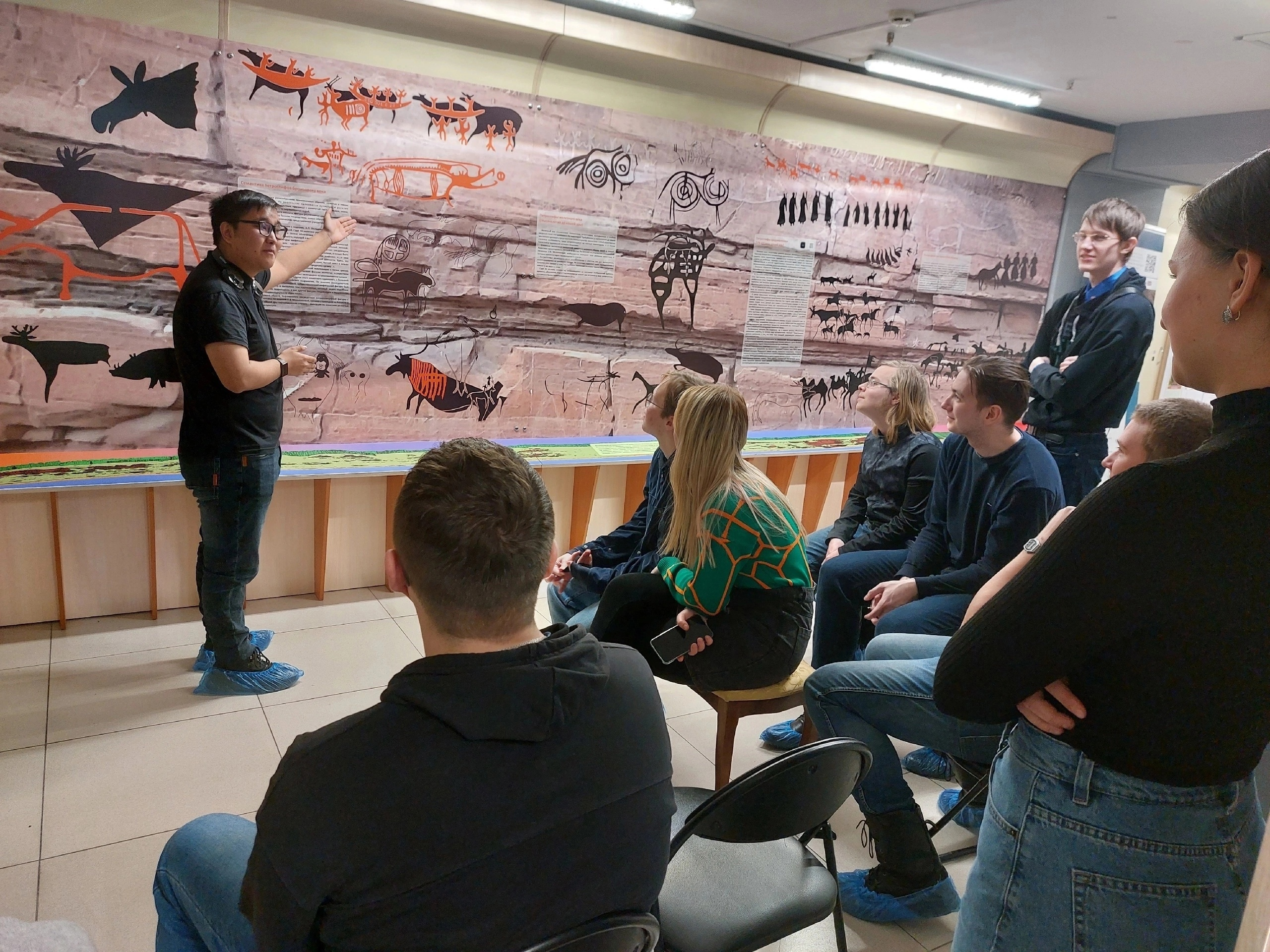 В историческом отделе научный сотрудник музея и выпускница факультета Дарима Мархаева провела экскурсию по экспозиции, посвященной коренным народам Прибайкалья – эвенкам, тофаларам и бурятам. Посетители познакомились с особенностями материальной культуры, быта и верований этих народов, а также поучаствовали в интерактиве, приуроченном к празднику Белого месяца – Сагаалгану. Дарима рассказала студентам об истории и обычаях этого праздника, а затем ребята освоили три разновидности традиционной игры «Шагай надаан».