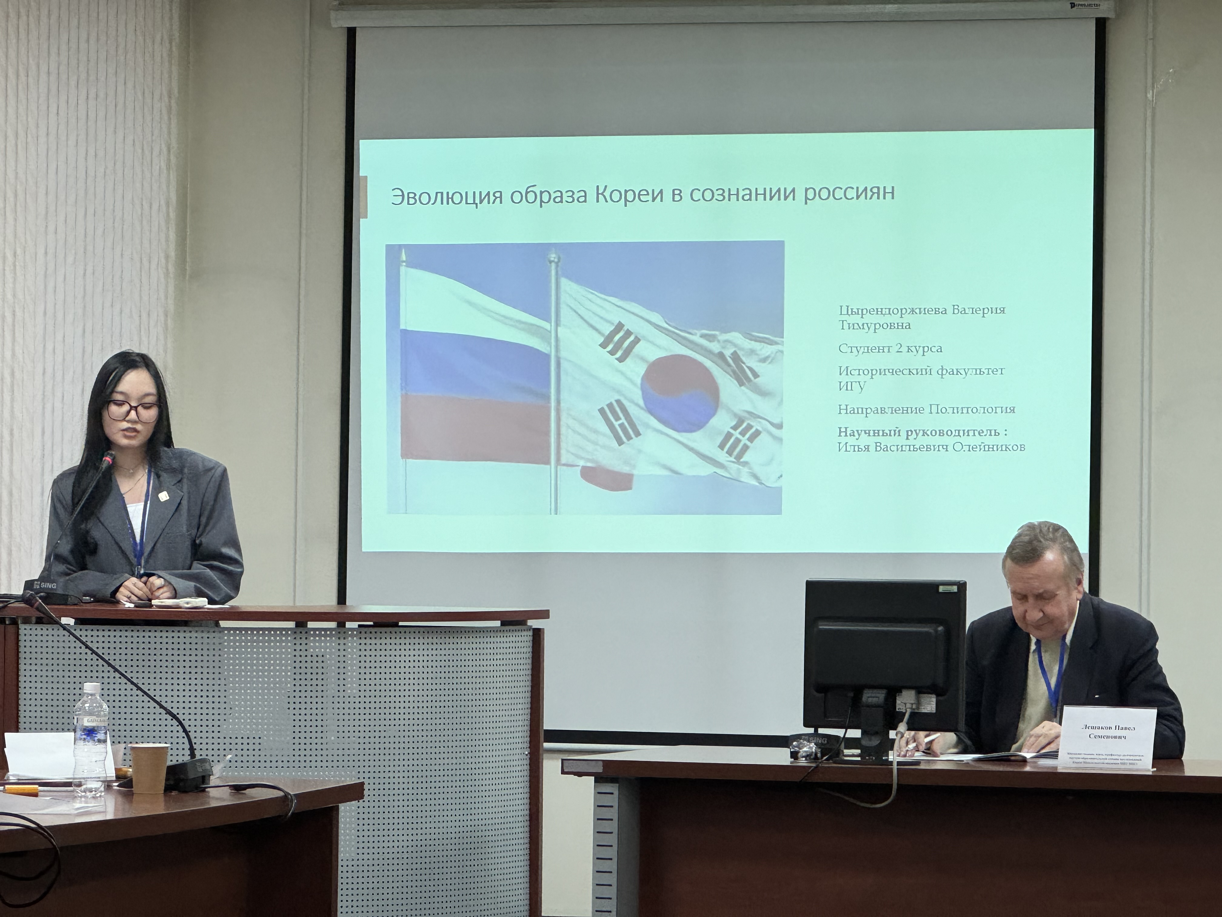 Активное участие в работе секции «Экономика и международные отношения» приняли студенты 2 и 4 курсов направления «Политология» исторического факультета ИГУ. Под научным руководством кандидата исторических наук, доцента кафедры политологии, истории и регионоведения Ильи Васильевича Олейникова были представлены доклады Анастасии Логачёвой («Фактор “мягкой силы” в сибирских проектах Генерального консульства Республики Корея в Иркутске»), Сэлмэг Дашинимаевой («Экономическое сотрудничество России и Южной Кореи в условиях санкционного режима») и Валерии Цырендоржиевой («Образ Южной Кореи в сознании россиян»). Под научным руководством кандидата исторических наук, доцента кафедры политологии, истории и регионоведения Михаила Леонидовича Рыбалко был представлен доклад Дмитрия Топучканова о региональном измерении образовательного сотрудничества между Россией и Южной Кореей на примере Иркутской области. Магистранты 1 курса направления «Политология» выступили в качестве слушателей.