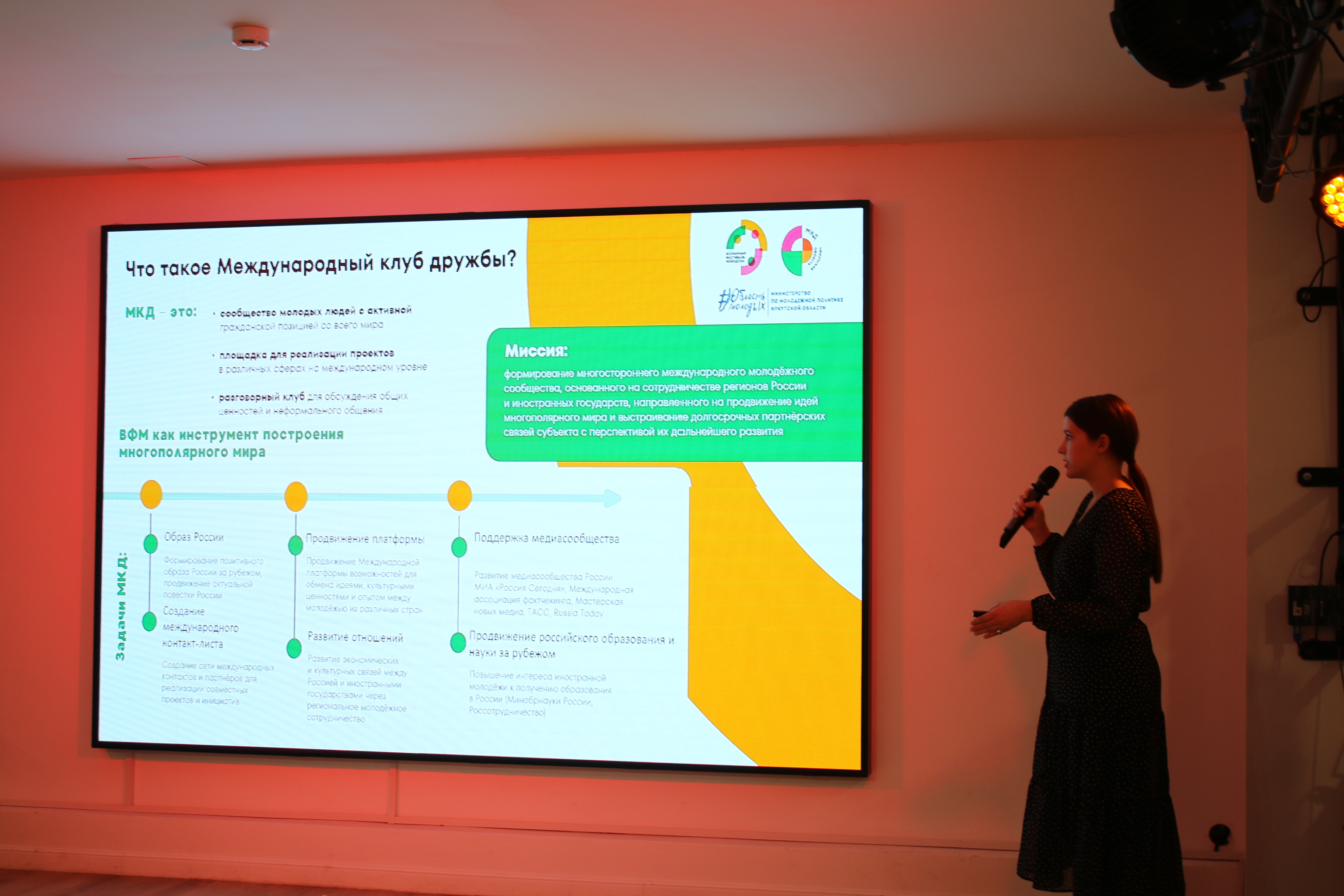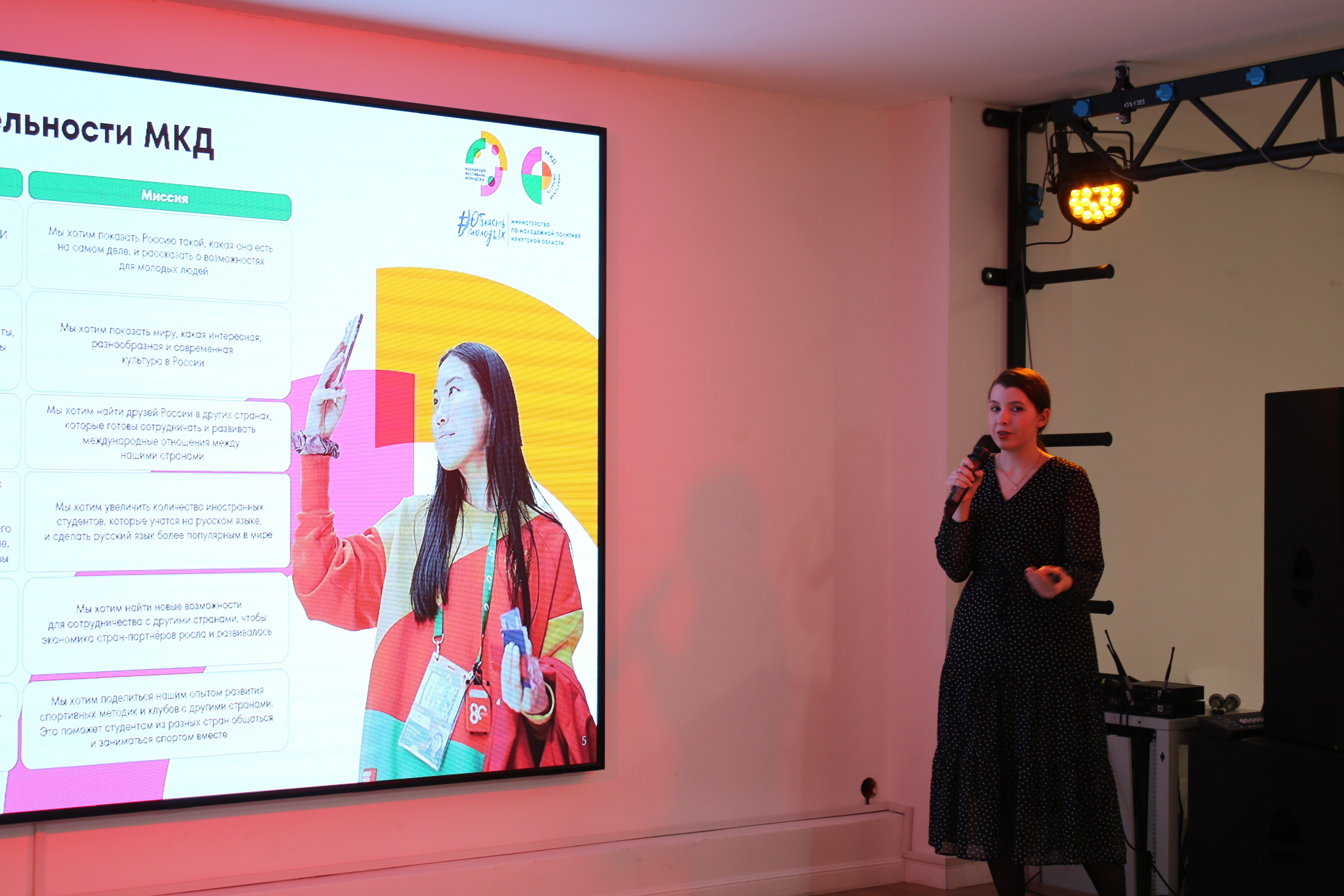 Студенты познакомились с деятельностью МКД и узнали о мероприятиях, проводимых в рамках международного сотрудничества: Всемирном фестивале молодёжи, Международном молодёжном форуме «Байкал» (особенно о площадке «Международные молодёжные клубы»), Международном молодёжном форуме «Евразия.Global».